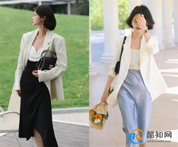西装+半身裙利落感十足的西装与女人味十足的半身裙结合起来,在上下身的搭配上呈现出一种风格上的混搭感,这种混搭风这两年非常流行,尤其是在日常出街搭配中,通过两种截然不同的单品结合到一起,让时尚感加倍。女性魅力比较强大的女生们可以使用浅色系的休闲西装上衣来搭配包身款式的半身裙,适度的包身可以通过一点点勾勒的搭配效果来呈现出身材上的曲线感,也可以使用适度开叉的设计方式来呈现出腿型上的优越感。想要增加亲肤性的话可以用利落感比较强的西装上衣来搭配缎面的半身裙,亲肤性非常强的同时还可以穿出高级感。格纹款式的西装上衣搭配上缎面的半身裙,在上下身的搭配上呈现出一种复古又温柔的搭配效果,在选择格纹西装的时候,可以根据自己想要呈现出来的搭配风格来选择不同纹理的大小。精致的小格纹比较适合年轻的女生,而粗放的大格纹比较适合稍微年长一些的成熟女性。