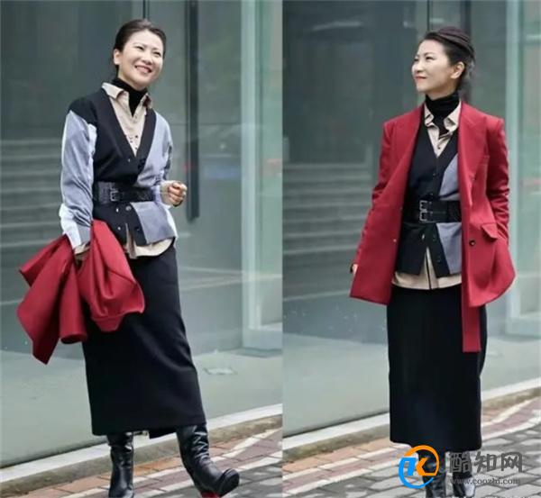 三、叠穿高级又显层次秋冬往往会用到叠穿这种穿衣方式,而如何能叠出条理性与层次感?其实并不难,女性可以先从最简单的马甲下手。图中这位女士就运用了马甲作为叠穿上衣中的过渡单品,V领+无袖的设计是展现层次的绝佳利器,鲜明的呈现出了与其他上装的不同。叠穿上装时最怕的就是出现臃肿感,因此要注意衣物的厚度配合,外套的版型最好要偏于宽松,才能防止衣服堆积而显得背部粗壮,如果外套不算宽大的话,那么可以选择敞怀穿着。比如图中使用的这件皮衣就选择了不拉拉链的穿衣方式,显得潇洒帅气,还能使整体的层次感更高的凸显。衬衫与打底衫是叠穿时的好搭档,两件上衣都偏于轻薄,当它们组合在一起时,可以直接与外套搭配使用,也可以再考虑加入一件上装。三件上装的叠穿是很多人能够把握住的穿搭方式,一旦超过三件,难度就会提升,而这位博主的look就是十分优秀的穿衣示范。黑色单品的相互呼应避免复杂感,红色西装又增添了整体的亮点,腰带可以使人看上去更利落,体型更纤细优越。